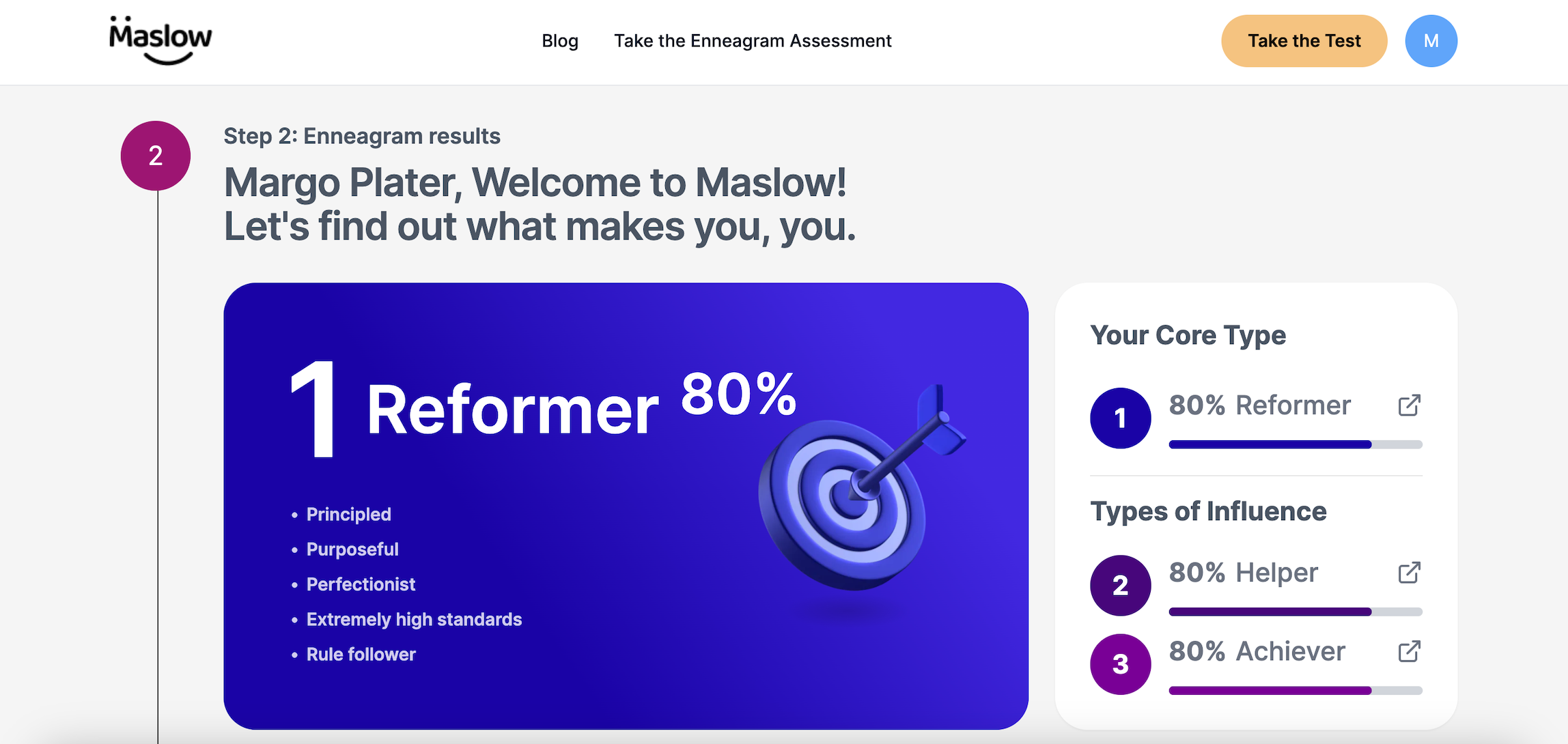 Once you know your type, it’s time to apply that understanding. Your understanding will begin in the comprehensive results section of your test. Use it as a roadmap to become the best version of yourself—not just for your own well-being but so you can bring more love, presence, and understanding to your relationships. Maslow offers many articles in order to help you understand the results of your Enneagram test, these can be found under the blog tab.